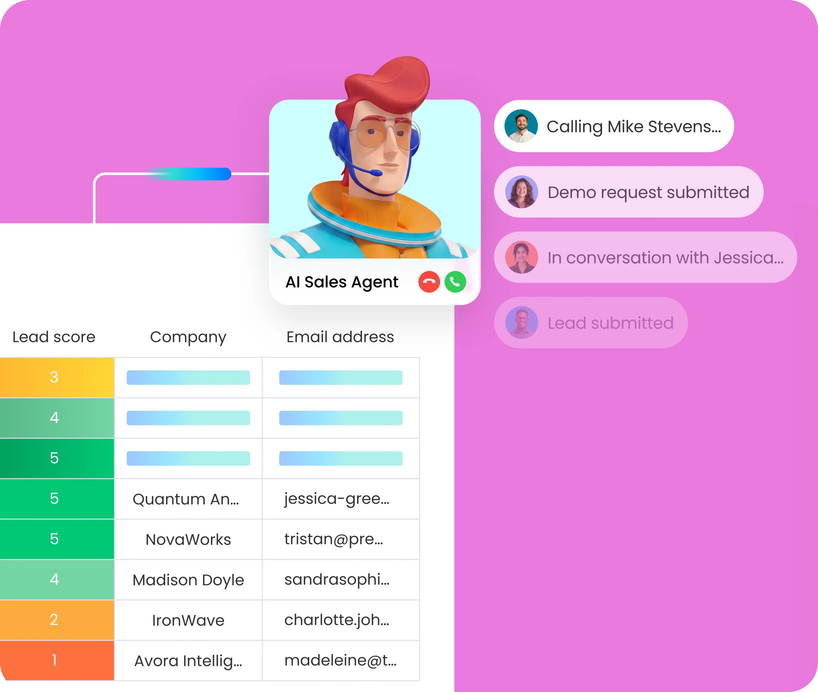 When a lead meets your criteria, the AI Lead Agent adds it to monday CRM with enrichment and a score. Leads can be automatically assigned, routed to an AI sales agent, or moved into the correct pipeline stage.