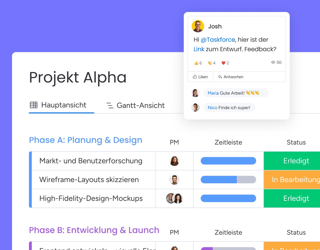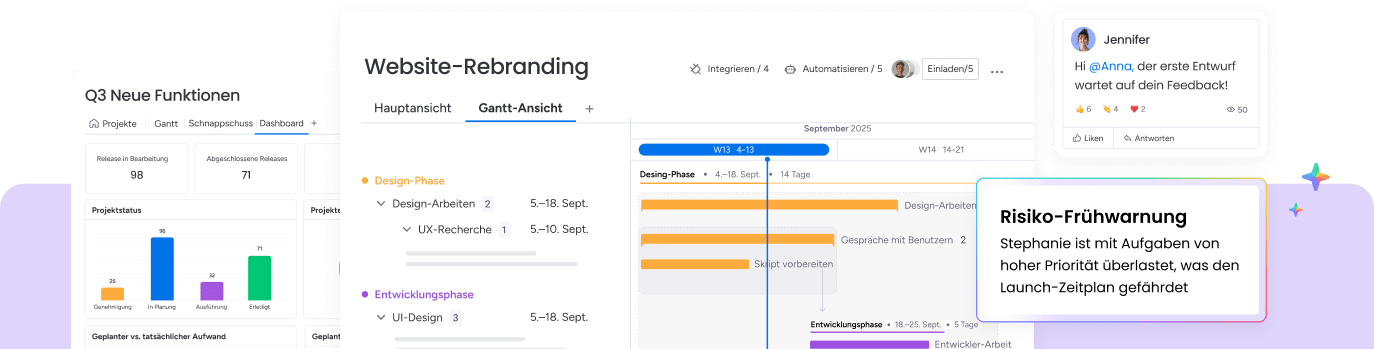 Mit fortschrittlichen KI-Funktionen, die Teams gerne nutzen, kannst du Projekte effizient durchführen und Abhängigkeiten koordinieren.