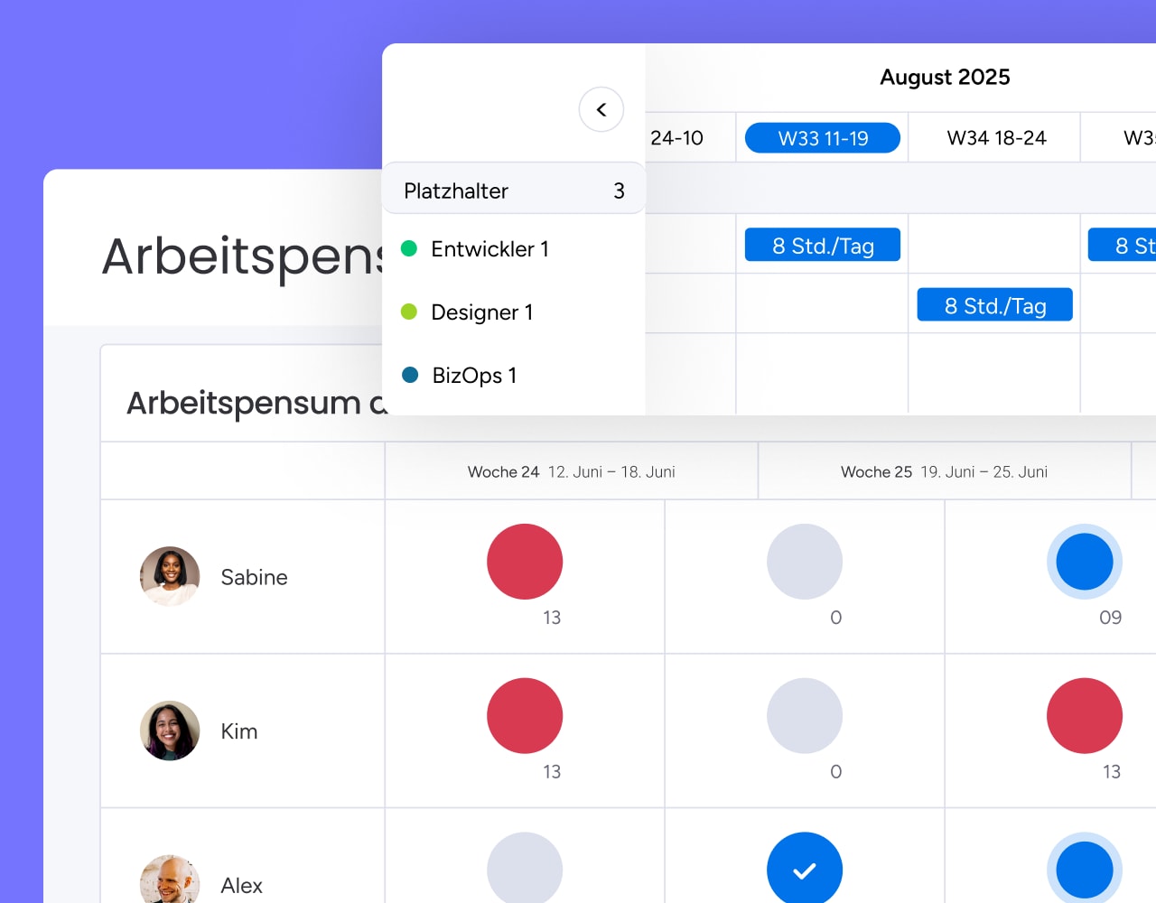 Verschaffe dir ganz einfach einen Überblick über die Ressourcenauslastung und nutze KI, um jedem Projekt die richtigen Mitarbeiterinnen und Mitarbeiter zuzuweisen.