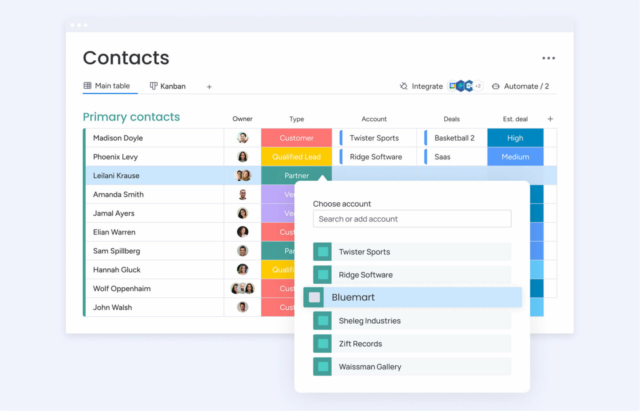 Connect sales metrics with marketing, customer success, and finance data with a powerful B2B CRM. Breaking down silos becomes effortless with monday CRM, showing you the complete revenue picture from first touch to renewal. When all your revenue teams work from the same data, you eliminate conflicting reports and gain a single source of truth.