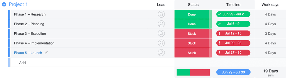 Mit dieser visuellen Vorlage von monday.com kannst du deine Teilprojekte nach festgelegten Zeiträumen strukturieren und den einzelnen Phasen verantwortliche Teammitglieder zuweisen.