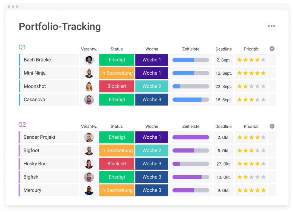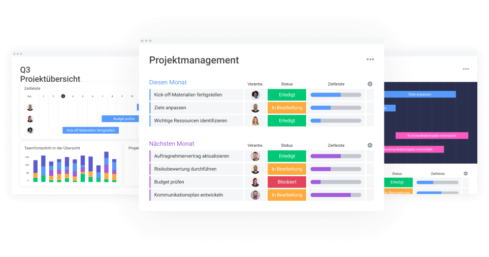 Organisationen aller Größen und Branchen können Vorlagen für Projektmanagement nutzen, um ihre Arbeitsprozesse zu straffen, das Task Management zu vereinfachen und damit ihre tägliche Morgenroutine der Arbeitsplanung zu entlasten. Mit monday.com kannst du dir die perfekte Vorlage für jeden Prozess erstellen, damit du stets die bestmöglichen Ergebnisse über den gesamten Lebenszyklus des Projekts erzielst.