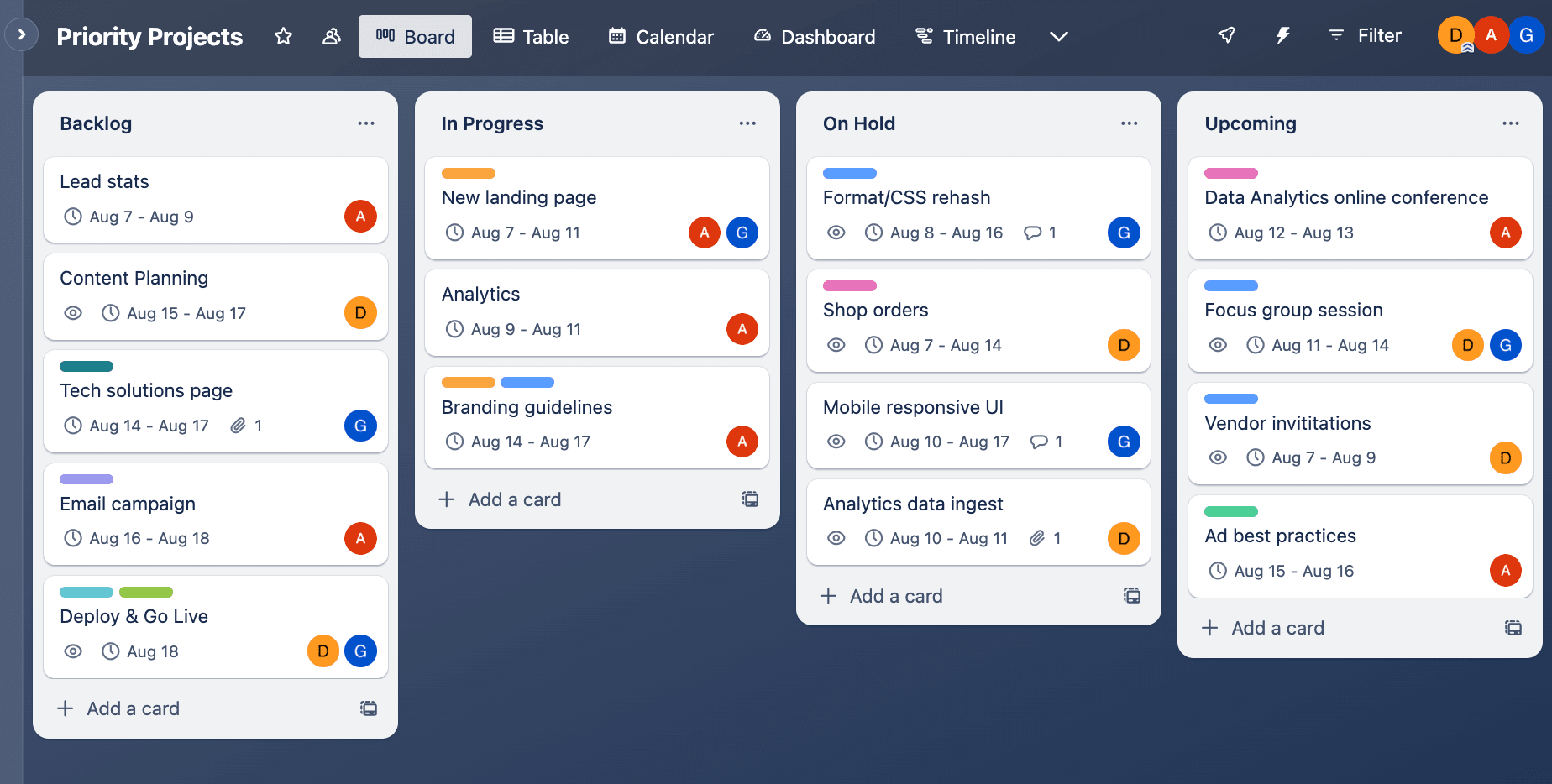 Personaliza columnas estándar como Backlog, Listo, En progreso y En espera según los procesos específicos de tu equipo.Tableros y tarjetas personalizables