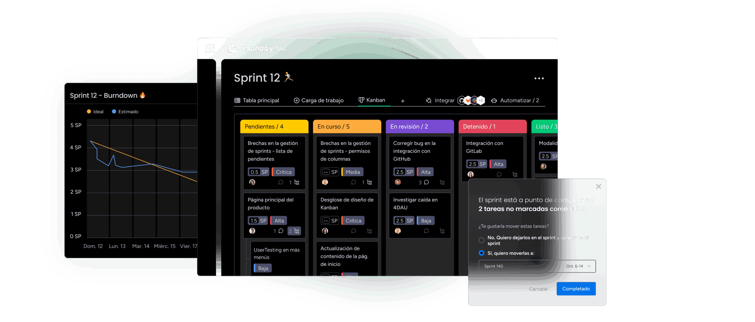 Por ejemplo, monday dev incluye herramientas Agile como Scrum y Kanban, pero también te permite trabajar con metodologías híbridas o personalizadas. Así tú eliges la que mejor se adapte a tu equipo.