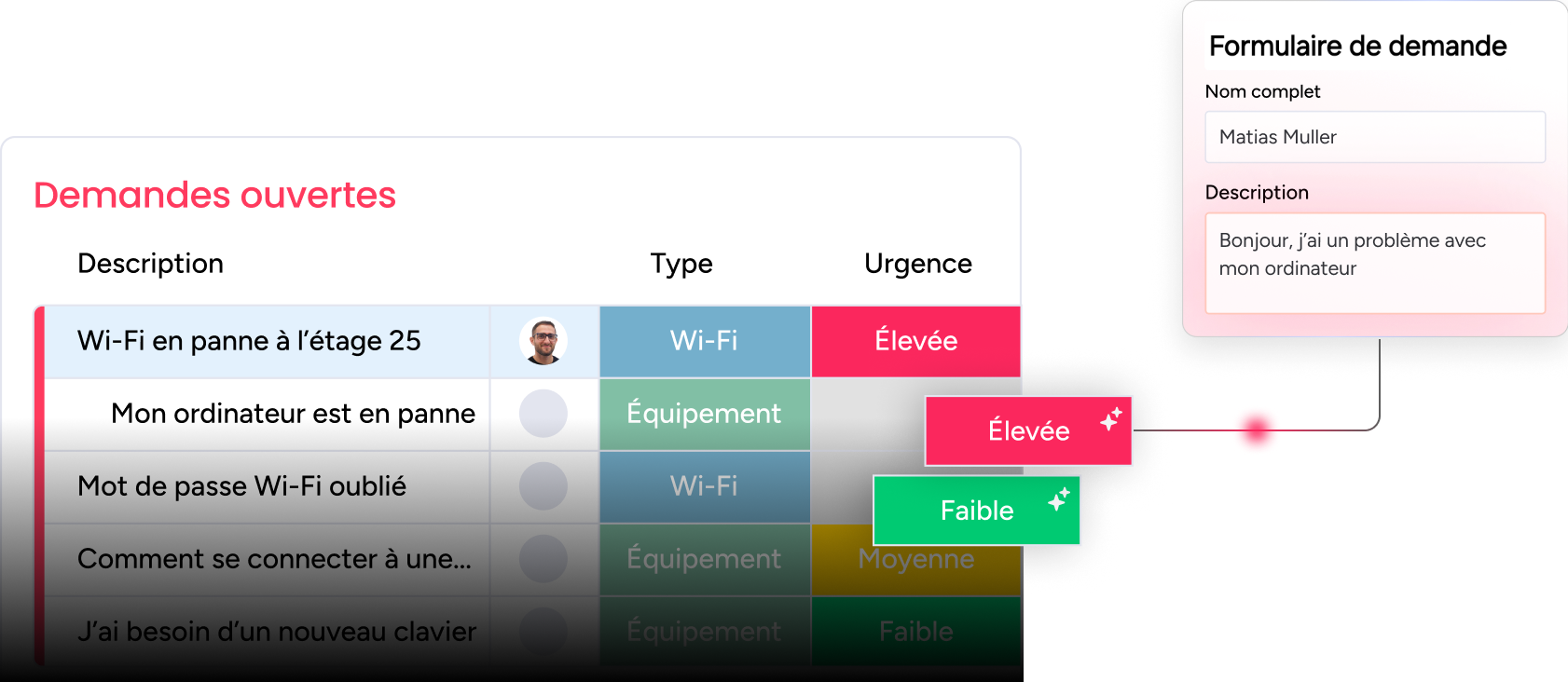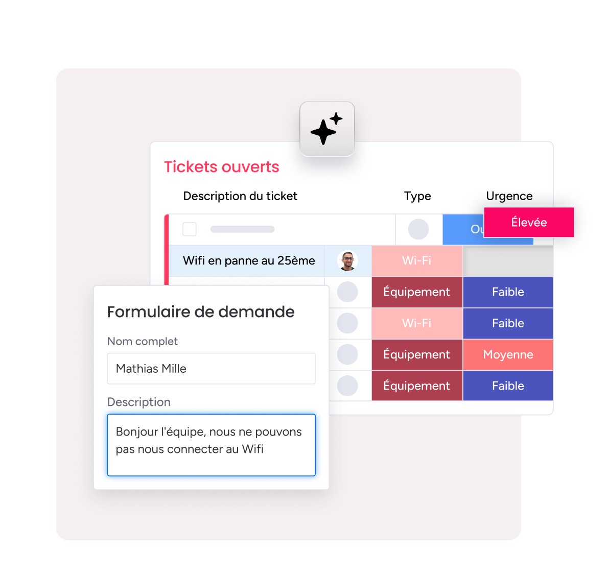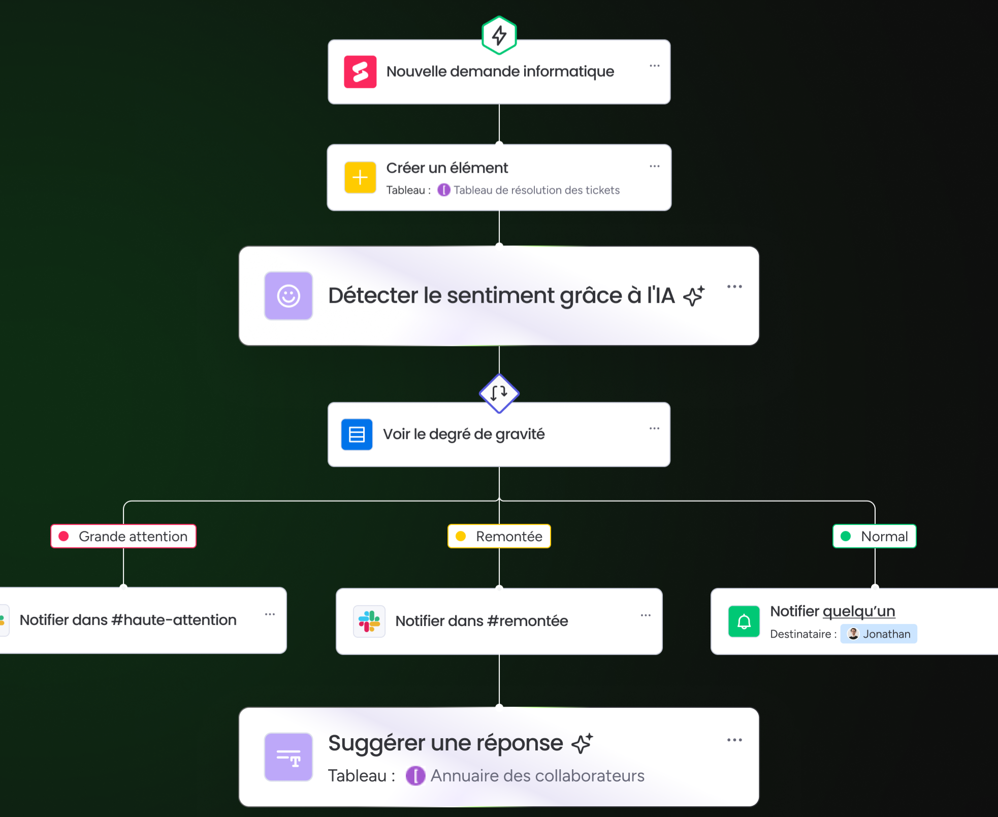 Les systèmes de ticketing IT nécessitent une organisation rigoureuse pour traiter chaque demande selon son niveau d’urgence. C’est pourquoi, monday service utilise une IA intégrée pour classifier, prioriser et router automatiquement les tickets vers la bonne personne ou l’équipe adaptée. Ainsi, vous avez moins de tri manuel à faire, vous obtenez des temps de réponse réduits et une gestion plus fluide des incidents IT, même dans un centre de services IT très sollicité.