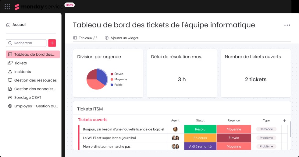 Connecté à l’ensemble de vos systèmes informatiques, monday service facilite la gestion des opérations IT, automatise vos workflows, optimise le monitoring IT et apporte une visibilité complète sur vos services. Du ticketing aux projets en passant par la collaboration inter-équipes, monday service aide les équipes IT à garder le contrôle avec une efficacité remarquable, même lorsque votre entreprise accélère sa croissance. Découvrons les fonctionnalités clés qui font de monday service une plateforme ITOM incontournable, que vous cherchiez à moderniser vos processus ITIL, à améliorer votre gestion ITSM ou à renforcer vos performances opérationnelles IT.