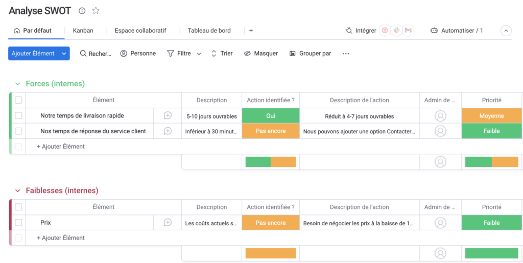 Ainsi, avec un logiciel de gestion des tâches efficace comme monday work management, vous pouvez facilement suivre toutes ces étapes et créer des tableaux SWOT clairs et visuels, collaborer avec votre équipe en temps réel, suivre vos actions dans le temps et automatiser tous vos rappels ou mises à jour.