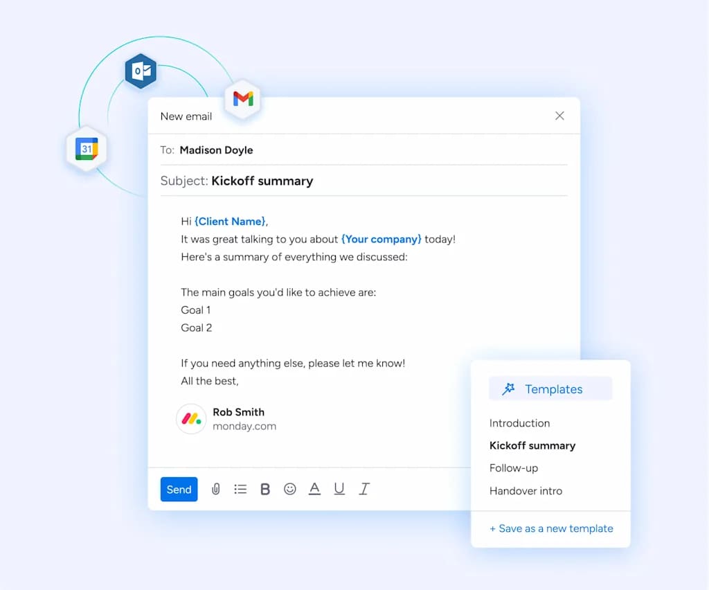 - AI 기반 이메일 작성: monday CRM의 AI 어시스턴트를 사용하여 개별 또는 일괄 메시지에 대한 상황별 이메일을 작성합니다.