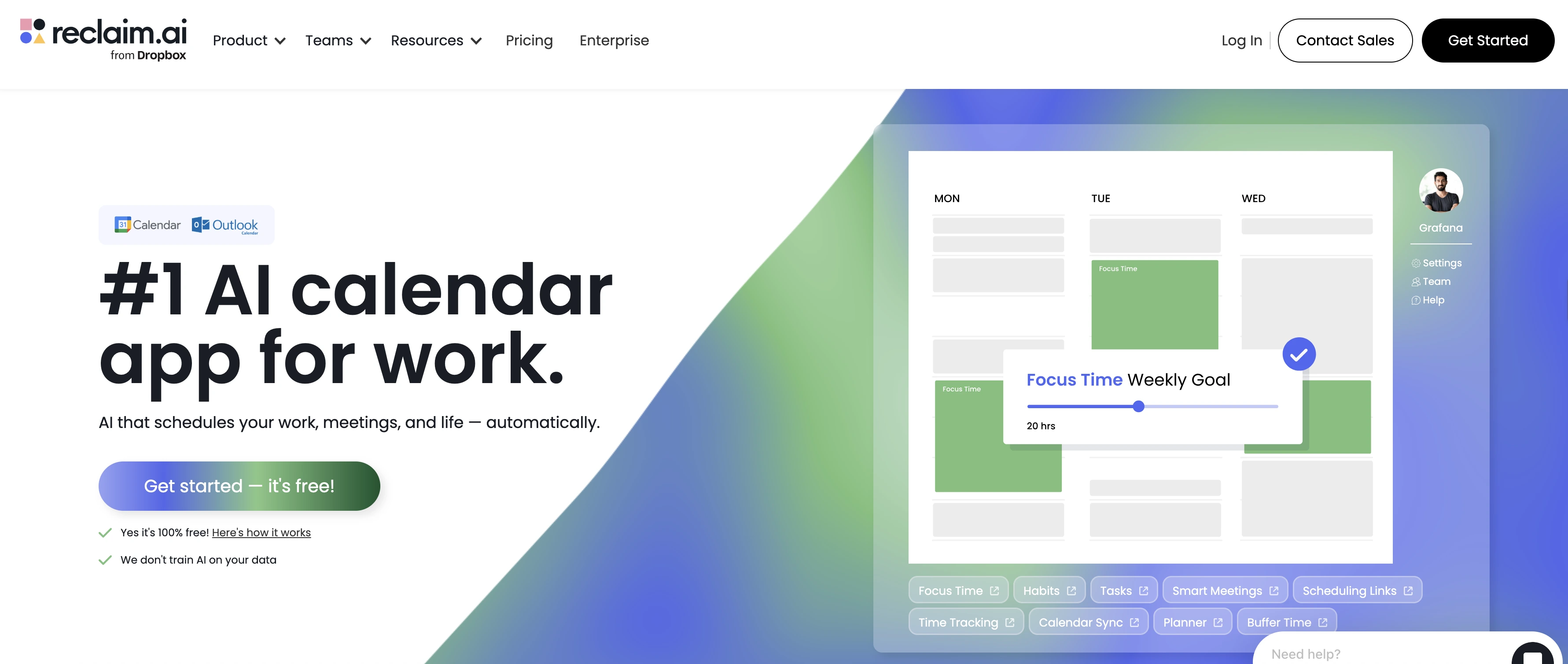 | Reclaim | Teams optimizing time blocking | $8/user/month | AI-powered scheduling habits and focus time | Google Calendar and Slack integration |