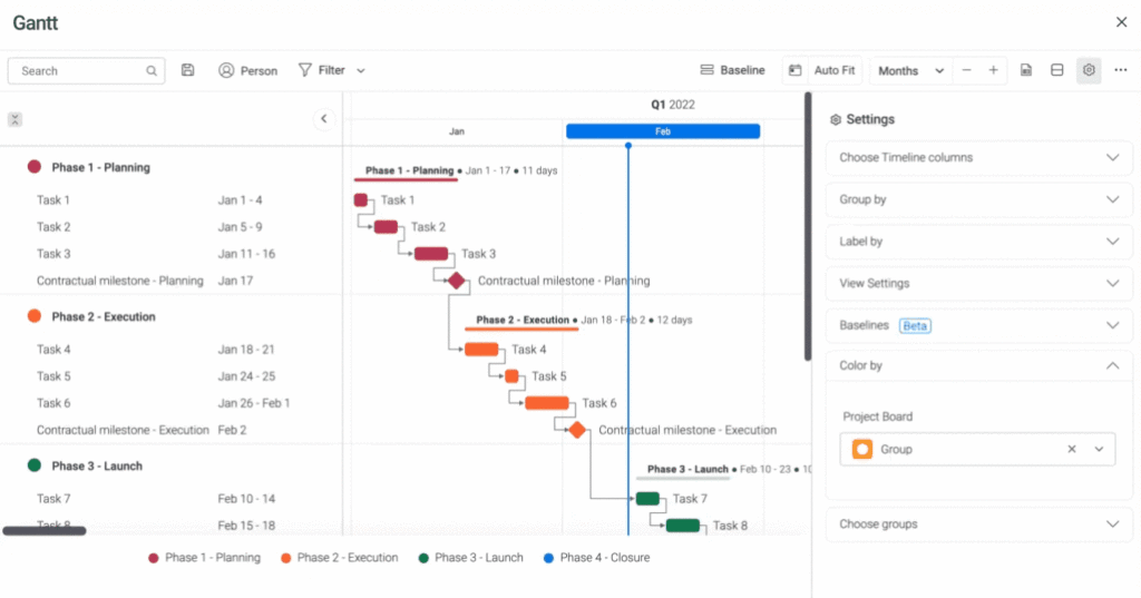 Setting up a Gantt chart is easy on monday.com because you have access to a built-in Gantt View and a widget for your project dashboard. You can also make changes to tasks directly in the Gantt View.