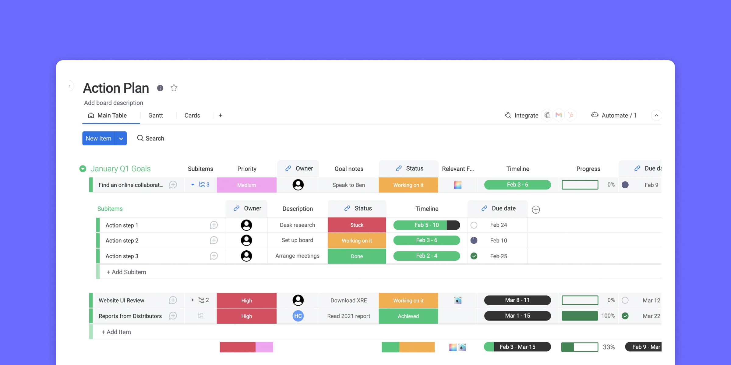 Create a dedicated board to capture your stretch goal, define milestones, assign owners, and set timelines. Features like the Timeline View and Status Column make it easy for everyone to see where work stands and what’s coming next.