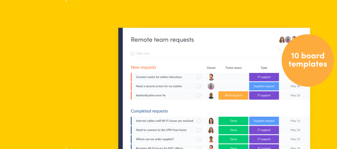 O quadro de solicitações da equipe remota é a forma perfeita de receber e organizar solicitações operacionais e de TI, ou qualquer outro tipo de solicitação de membros da equipe remota. Envie o quadro em formato de formulário para todos os trabalhadores remotos e peça que eles preencham suas solicitações – as respostas serão usadas para preencher o quadro automaticamente, integrando-se facilmente ao seu fluxo de trabalho. Você também pode dedicar um grupo para as dúvidas ou perguntas frequentes pendentes, para usá-lo como recurso quando não houver equipe de TI disponível para esclarecimentos.