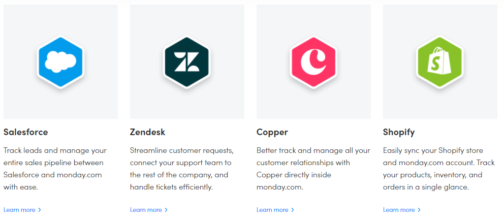 在 monday sales CRM 裡,你可以一次整合多種類型的工具,例如:
