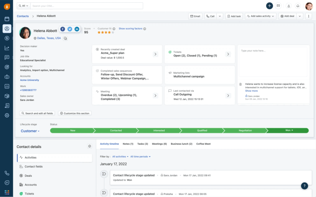 Freshsales 主打自動化聯絡人管理,能自動擷取並記錄客戶資料,省下人工輸入的時間。它還提供聯絡人排序功能,幫你在最恰當的時機,鎖定並跟進那些高價值的潛在客戶,提升成交機會。