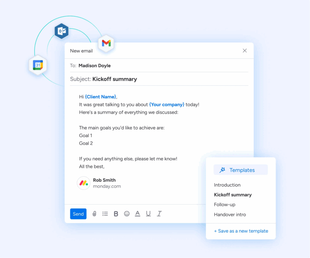 這時候,電子郵件範本就很好用。monday CRM 不只讓你用範本,還能結合 AI 生成的專屬內容,做到更精準的個人化溝通。加上自動化規則與即時通知,你能第一時間知道客戶何時收信、開信、甚至回覆。AI 自動跟進也能幫你省去手動追蹤的麻煩,讓每位名單都不會被遺漏。