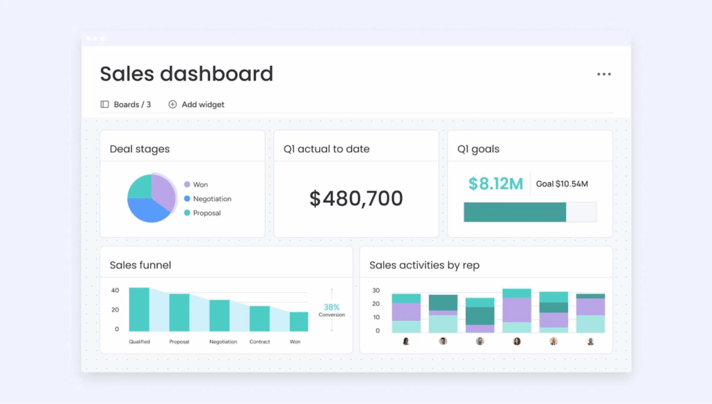 monday CRM 提供 AI 儀表板、即時報表、預測圖等功能,讓你清楚看到成交率的變化,也知道業務團隊的表現到底好不好。