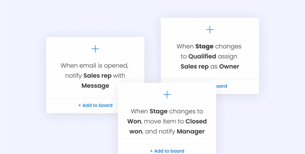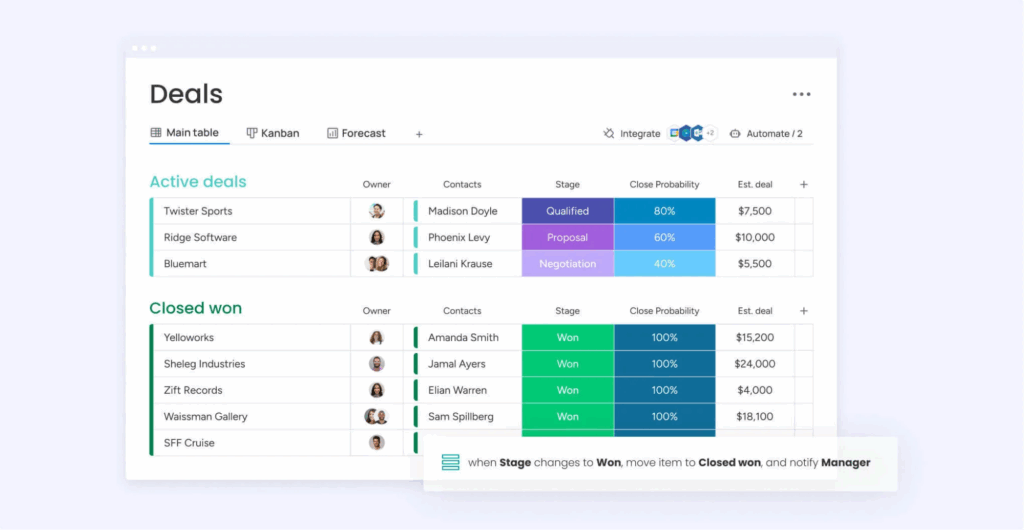 多元自動化範本:在 monday CRM 裡,自動化流程會在背後精準運作,把那些重複又耗時的手動工作全接手。你可以用它的自動化範本來設定行程提醒、把新名單自動分派給指定業務,或是在特定時間後自動發送後續跟進訊息,完全不用自己盯著做。