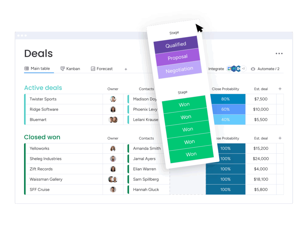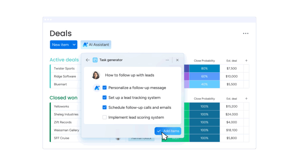 選擇合適的銷售軟體是提升業績的關鍵,而monday CRM就可以幫助你達成此目的!其不僅擁有簡單易懂的使用介面,更結合AI輔助與高度自動化,讓整個銷售流程更有效率,助團隊快速推進每個階段,並實現以下優勢: