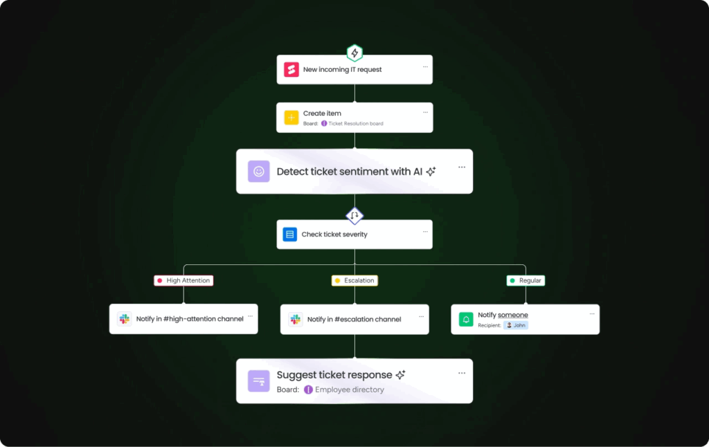 monday work management 是一款能真正「讓 AI 幫你動起來」的自動化平台。透過可擴展的 AI 工作流程建構器,你可以把公司的策略變成具體執行流程,減少手動操作、降低成本。平台整合了視覺化任務管理+AI 智能模組,像是情緒分析、自動分類、內容摘要等功能,全都不用寫程式就能完成。