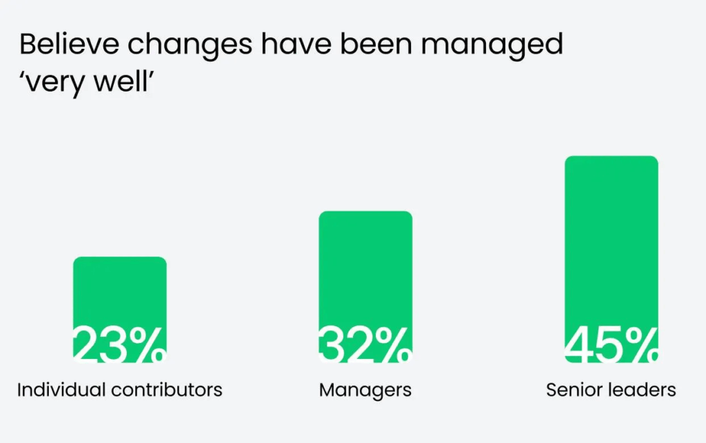 有 45% 的高階主管認為公司很擅長管理變革,但只有 23% 的第一線員工認同這說法。