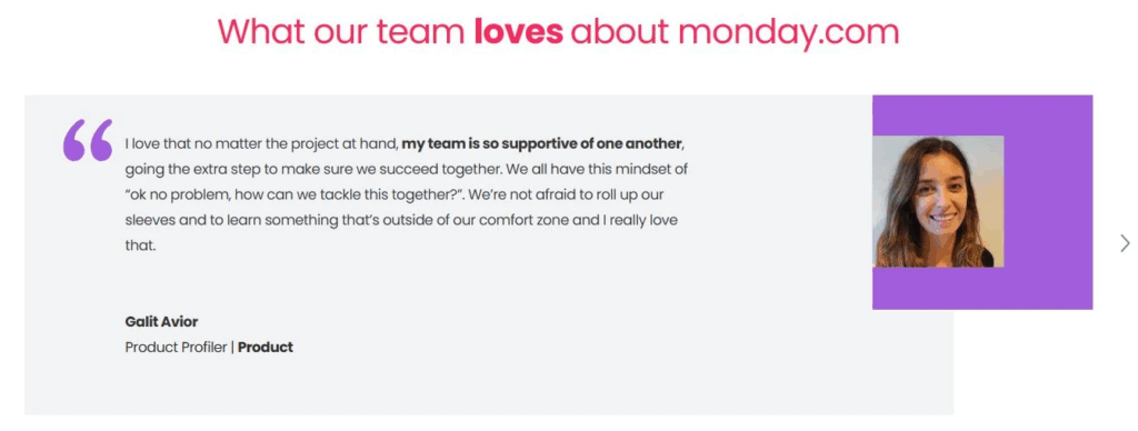 舉個例子,monday.com 的「Careers」頁面不只標明我們是 Great Place to Work 的獲獎企業,還放了滿滿員工心得,直接用真實的聲音傳達「這裡很值得加入」。