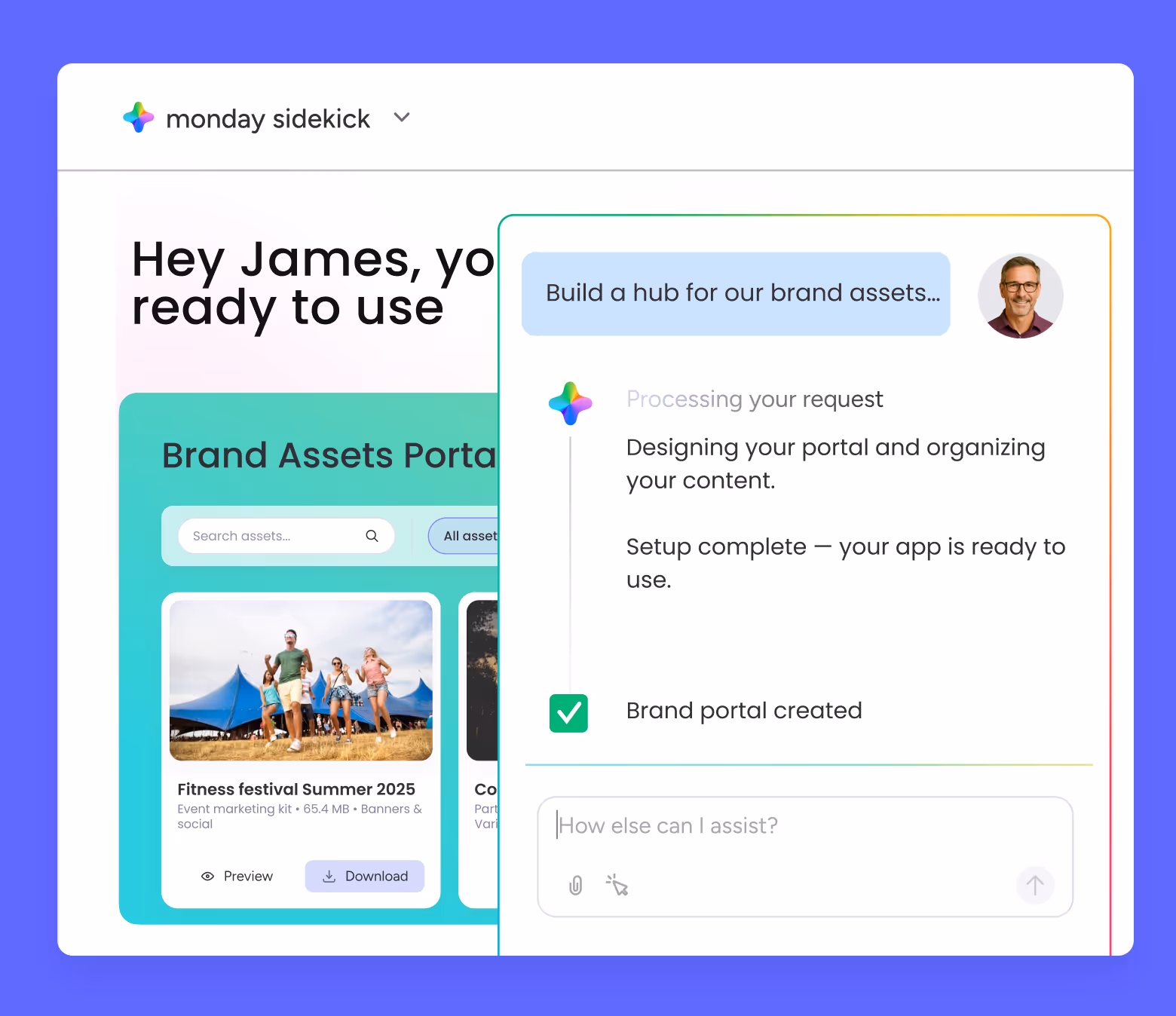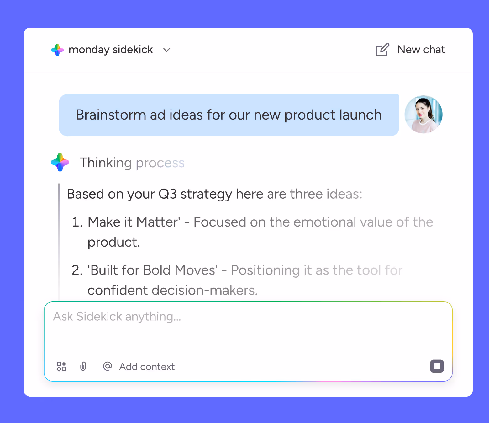 monday sidekick is an intelligent, context-aware AI assistant built directly into monday.com. It understands your work, connects to your tools, and helps you think, create, and take action through natural conversation, all inside your workspace.