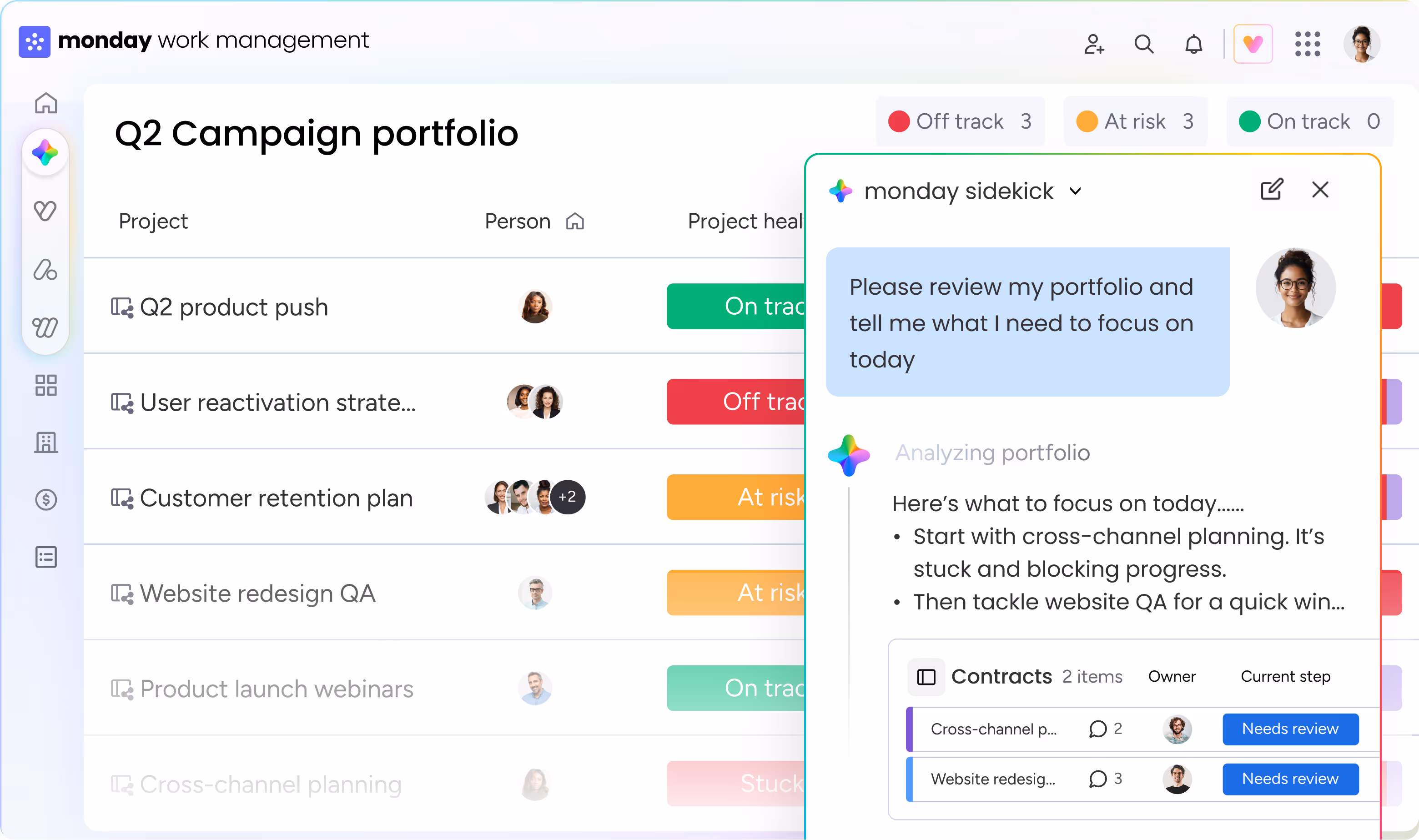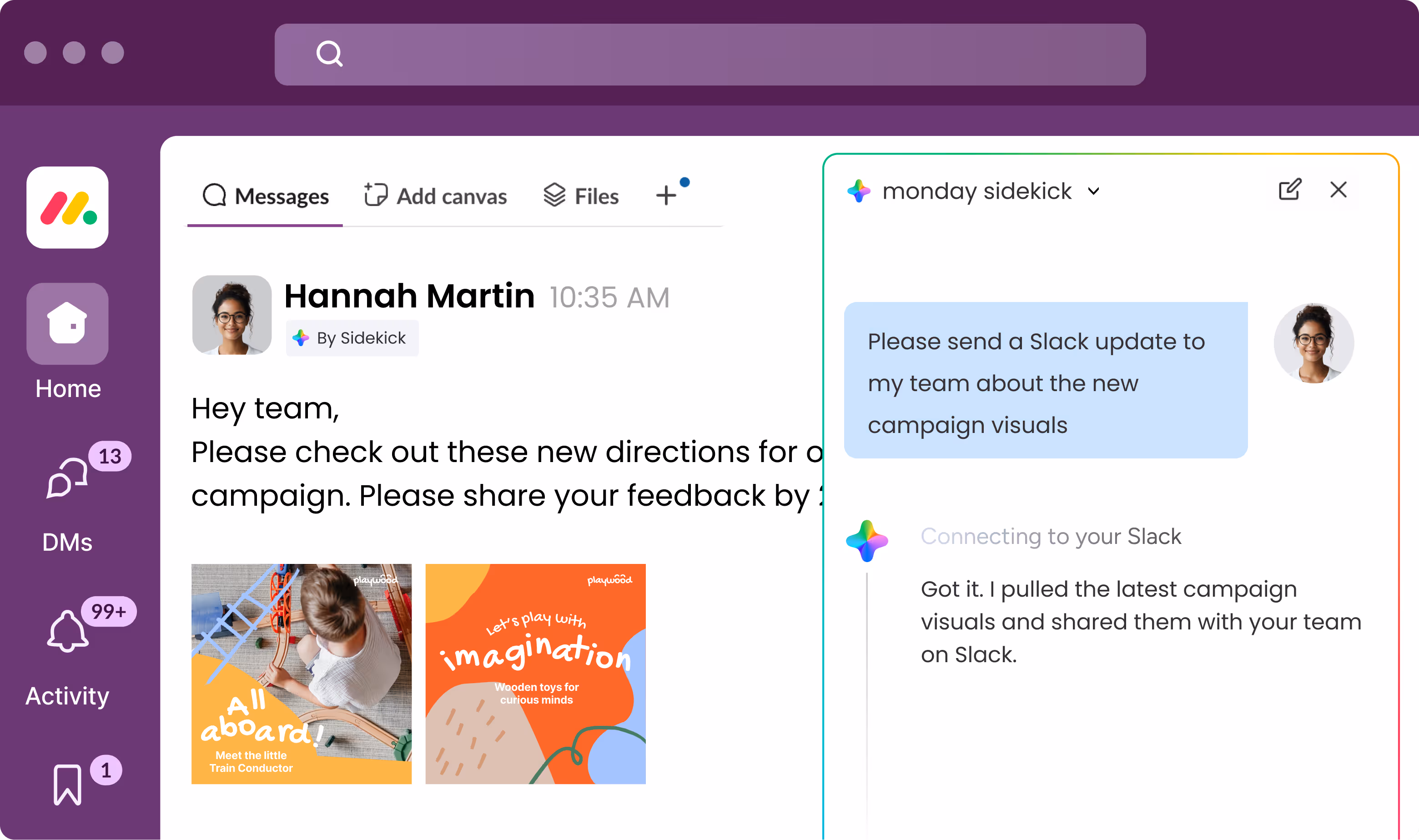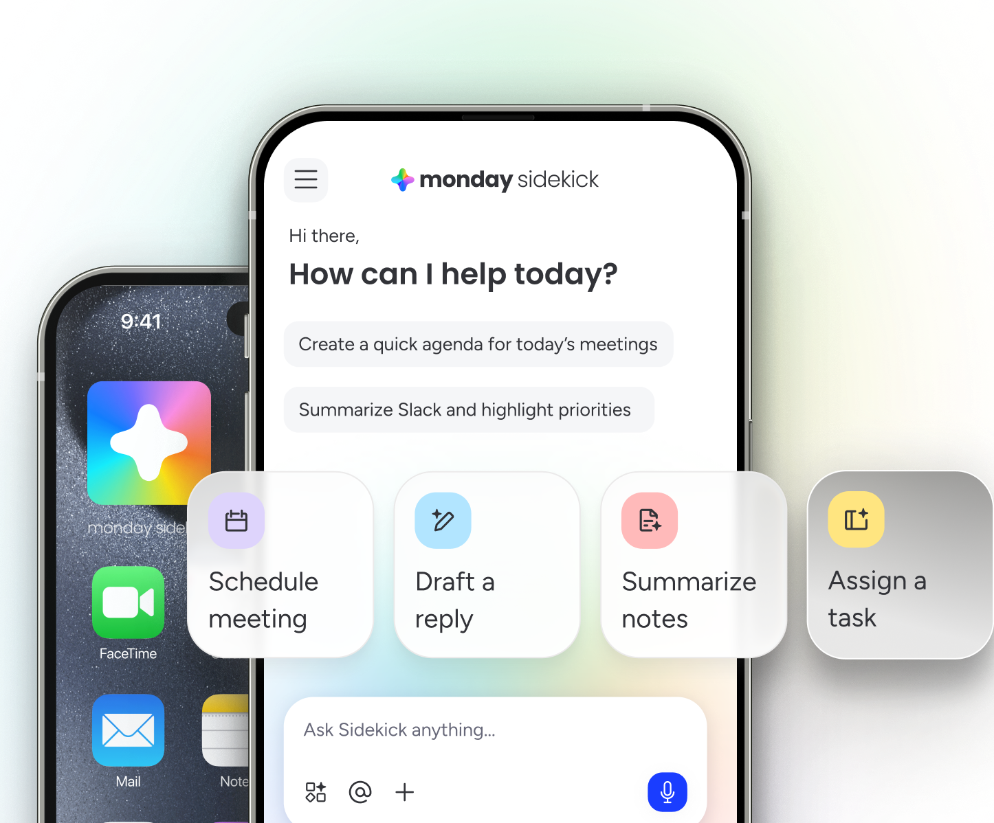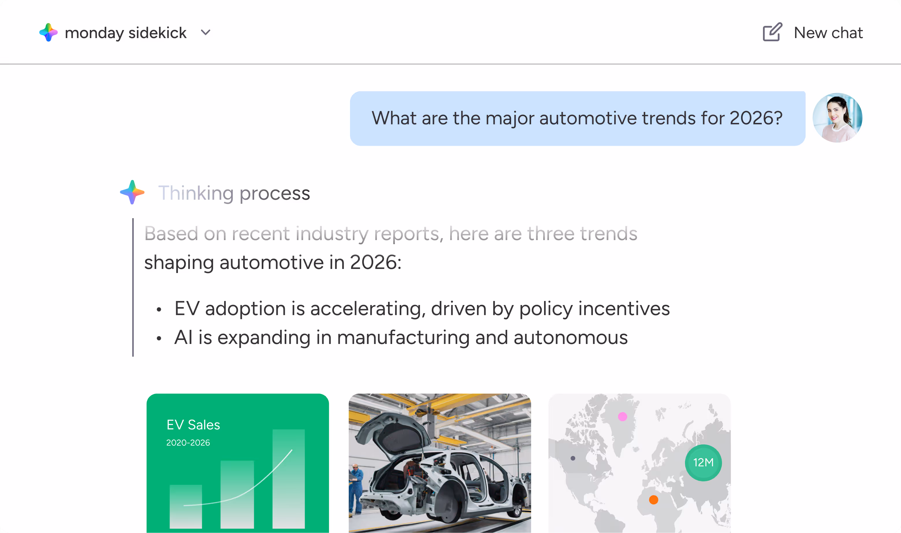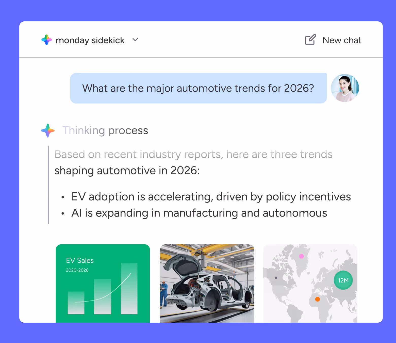 monday sidekick brings together leading AI models, your work data, and your work apps (Slack, Gmail, Google Calendar, and more) in one place. It understands your business context and uses it to analyze information, generate content, and take action directly inside your workflows, without leaving monday.com.