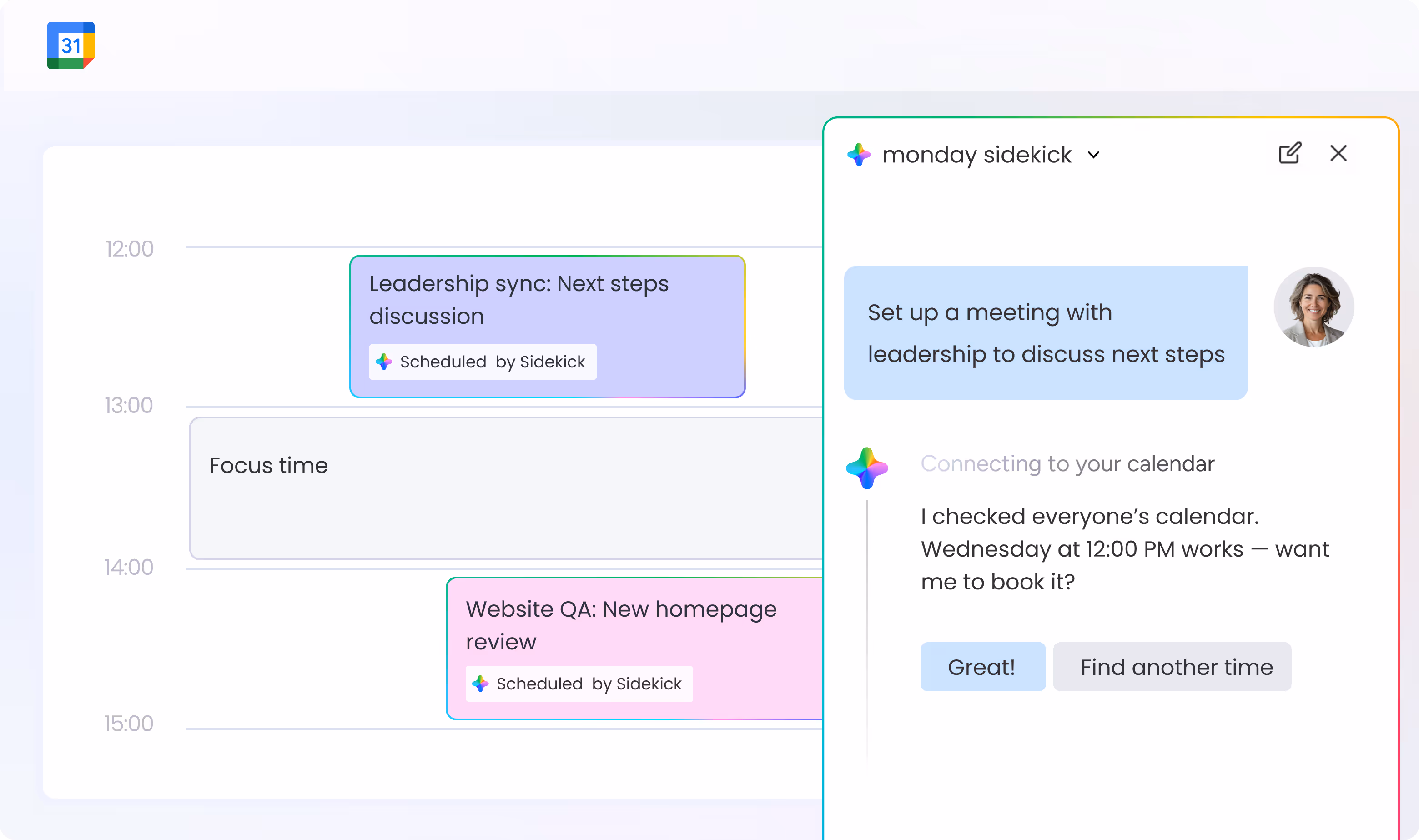 monday sidekick is built directly into your monday.com workspace. Unlike standalone AI tools, it’s connected to your boards, docs, and apps like Slack, Gmail, and Google Calendar, so it understands your work context and can take action on your behalf, not just answer questions.